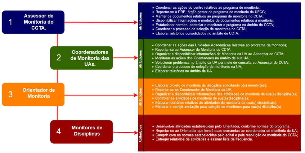 As atribuições gerais dos diversos integrantes do programa de monitoria no âmbito da UFCG e no CCTA são as seguintes: