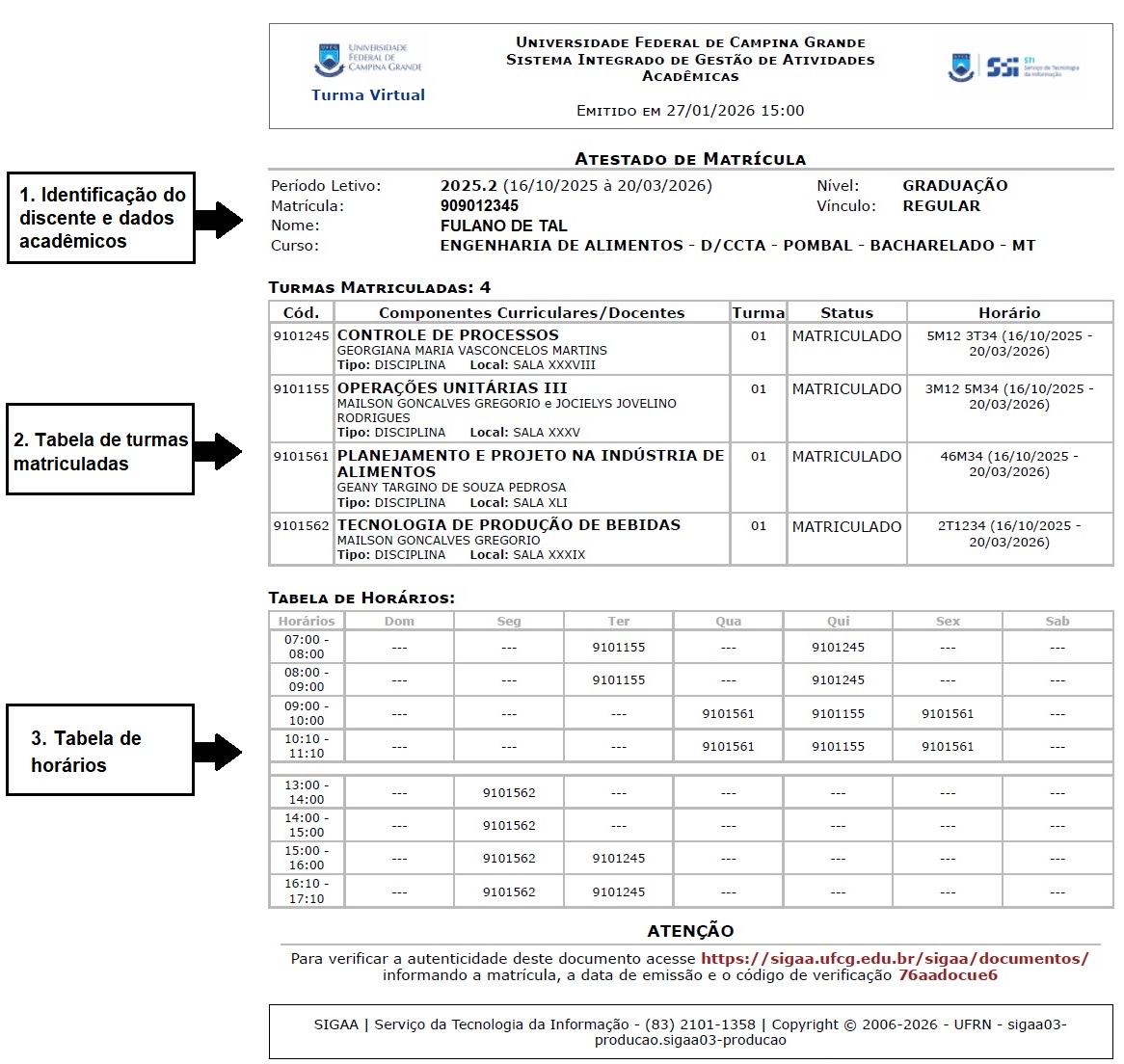 Essa parte do Atestado de Matrícula permite ao estudante verificar, de forma detalhada, quais disciplinas está cursando, bem como os respectivos professores, salas e horários.