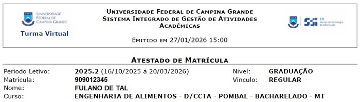 | Atestato de Matrícula | Documento oficial que comprova o vínculo do estudante com a Universidade Federal de Campina Grande no período letivo vigente. |