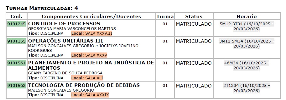 - O código e nome de cada componente curricular: Além do nome, geralmente as disciplinas são identificadas nos sistemas da UFCG por um código único (ver destaques em verde na imagem abaixo);