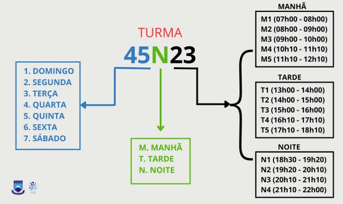 - Os dias e horários em que a disciplina é ofertada: Na última coluna à direita (ver destaques em cinza na tabela acima) é apresentada a expressão de horário para identificação dos dias, turnos e horários nos quais cada disciplina é ministrada. Para facilitar o entendimento, veja a ilustração a seguir:
