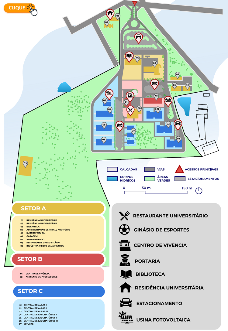 Além da localização espacial já apresentada, é importante que você conheça detalhadamente as principais instalações do centro, tais como biblioteca, laboratórios, ambientes de aulas, residências universitárias e restaurante universitário. Clique aqui ou na imagem abaixo para acessar melhor cada um desses ambientes.