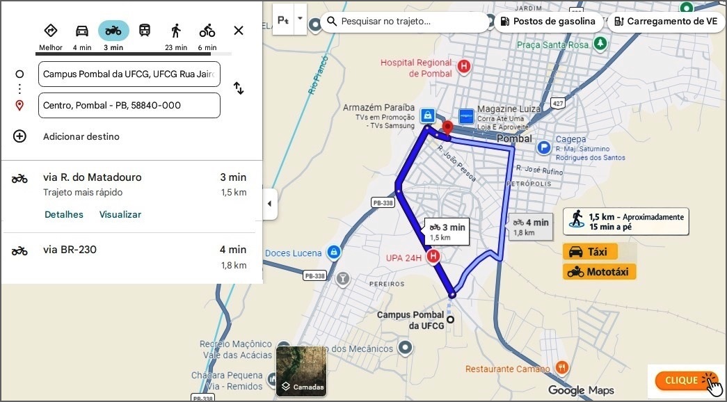 Trajeto entre o campus Pombal da UFCG e o centro da cidade.
